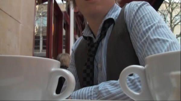 The mug shot was purely spontaneous as we were sat thinking of shots which we could do at a cafĂ© when I thought to aim the camera through the mugs. We had a shot of myself, but I hit the table a few times which made the camera shake, so we had to edit it out, but Matt’s shot worked well to use a different type of shot within our film.